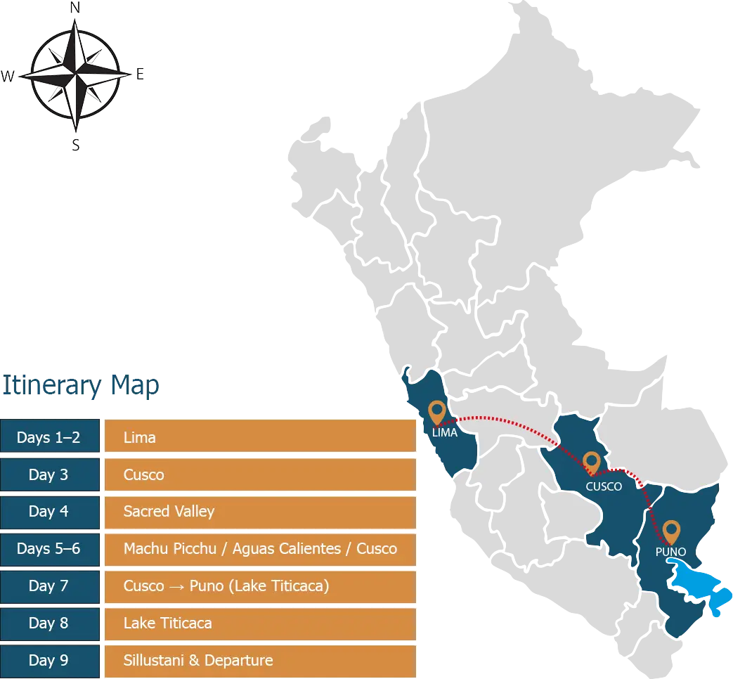 This day, you will visit the archaeological Inca side of Sillustani, the tour begin with a slowly walk up on the path to see the huge stone burial towers built by the Incas and finally up to the top for a view of the Umayo lake and a wonderful scenery. Them you’ll by transfer to Juliaca airport for domestic flight to Lima, after connection and then home.
